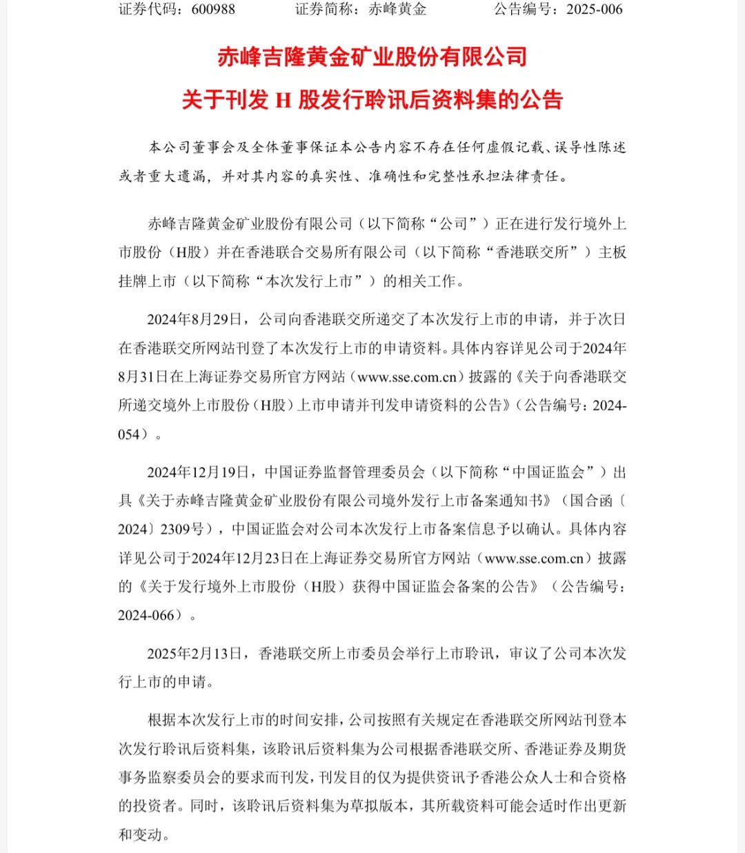 据公告,上述聆讯后资料集为赤峰黄金根据香港联交所、香港证券及期货事务监察委员会的要求而刊发,刊发目的仅为提供资讯予香港公众人士和合资格的投资者。同时,该聆讯后资料集为草拟版本,其所载资料可能会适时作出更新和变动。